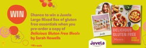 We’ve partnered up with Juvela Gluten Free Foods and are offering three people the chance to WIN one of their Large Mixed Boxes, full of gluten free everyday essentials, when you pre-order a copy of Delicious Gluten Free Meals by Sarah Howells